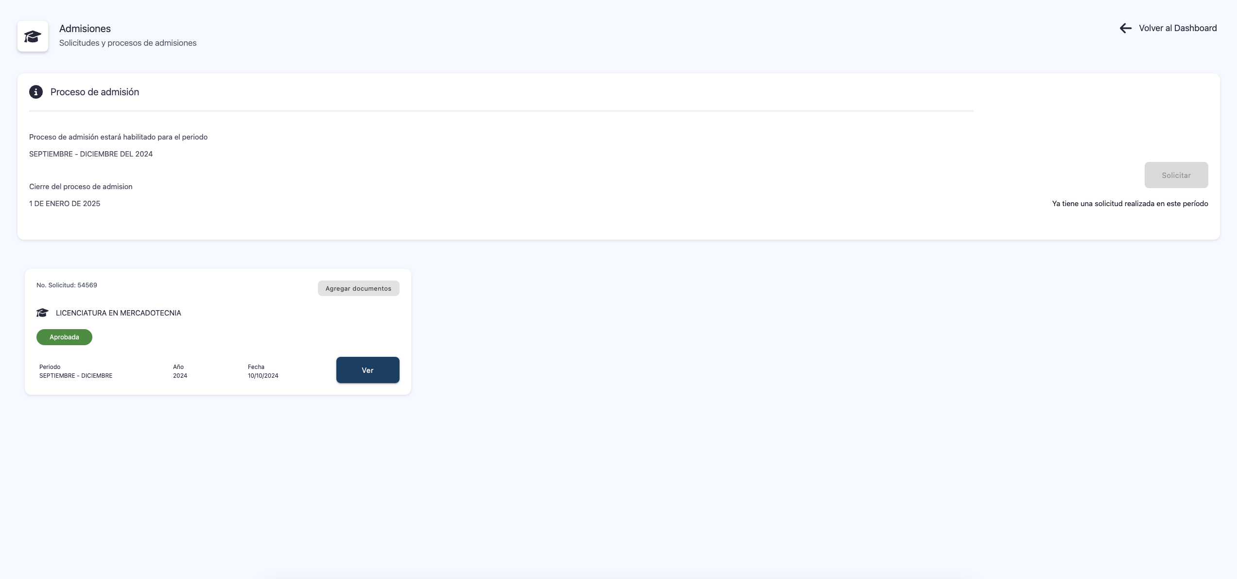 - Si el periodo de admisiones está abierto, el usuario puede crear una nueva solicitud haciendo clic en el botón "Solicitar Admisión".