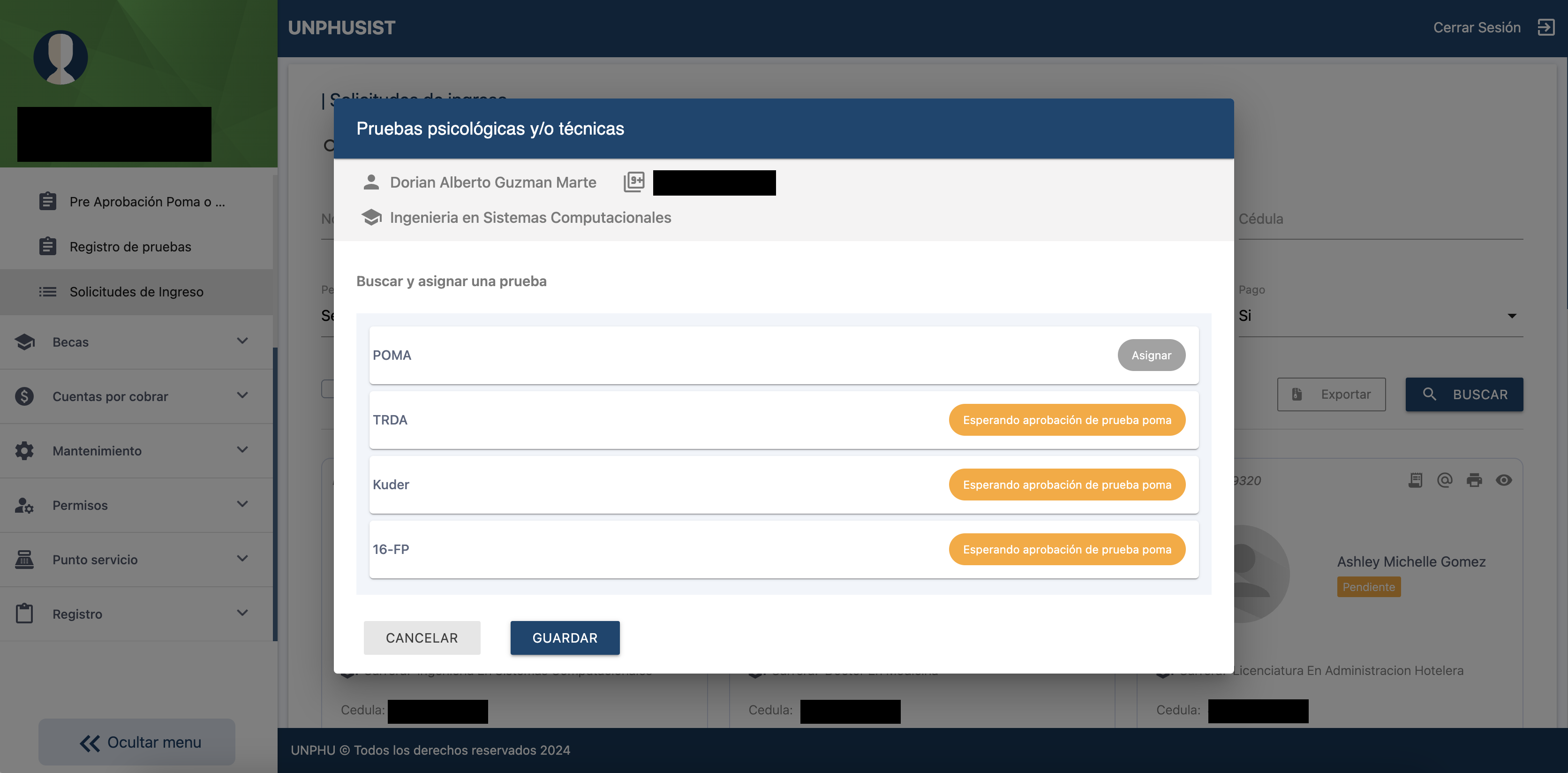Dependiendo del programa académico y los requisitos, el personal administrativo también puede asignar otras pruebas desde el mismo modal.