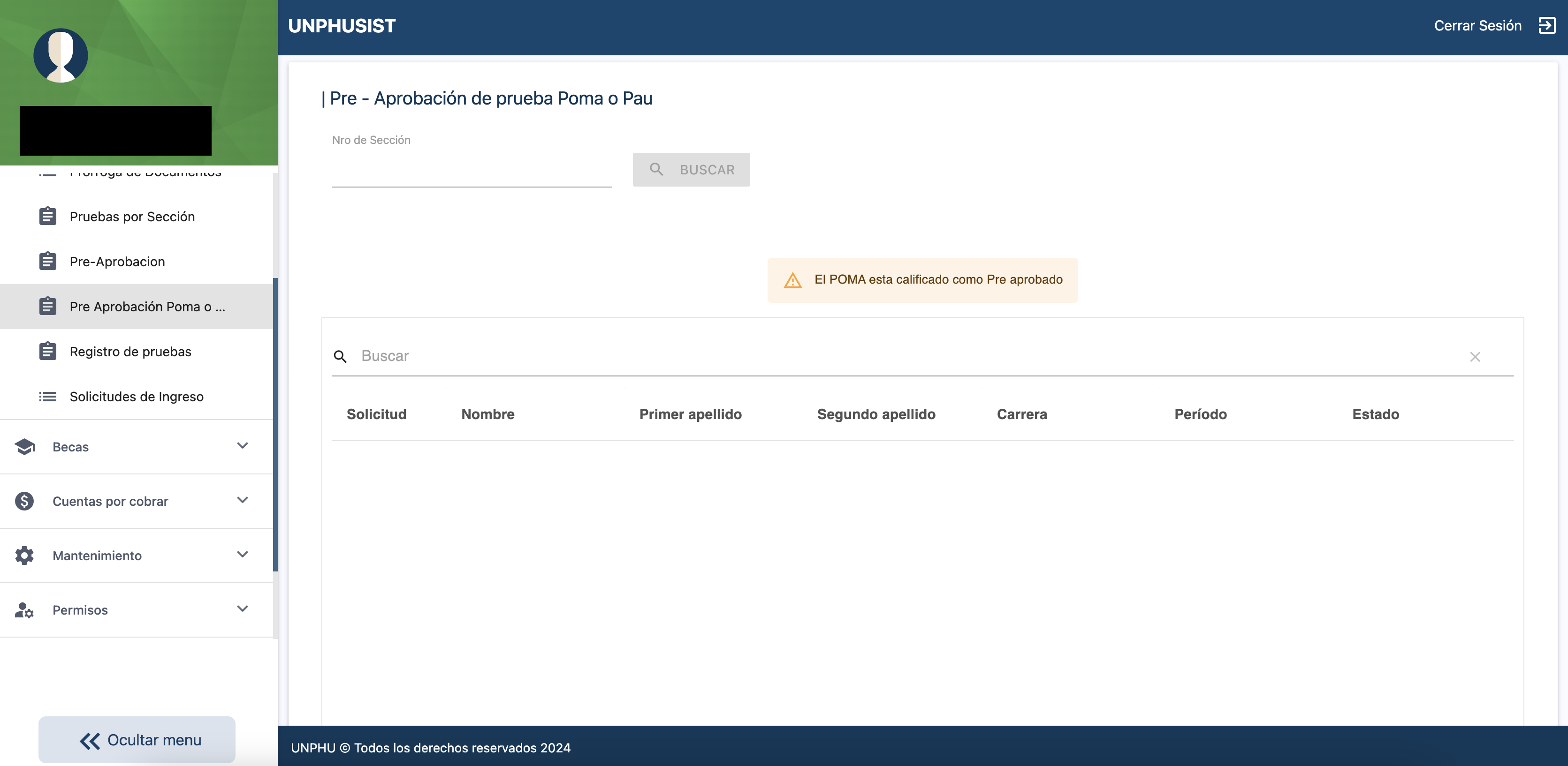 Después de que el solicitante realiza las pruebas asignadas (como la Prueba de Orientación y Medición Académica - POMA o la Prueba de Aptitud Ocupacional - PAO), el sistema gestiona automáticamente la pre-aprobación de las mismas. La pre-aprobación es un proceso en el que se verifican las calificaciones de los solicitantes y se determina si han cumplido con los requisitos mínimos para continuar con el proceso de admisión.