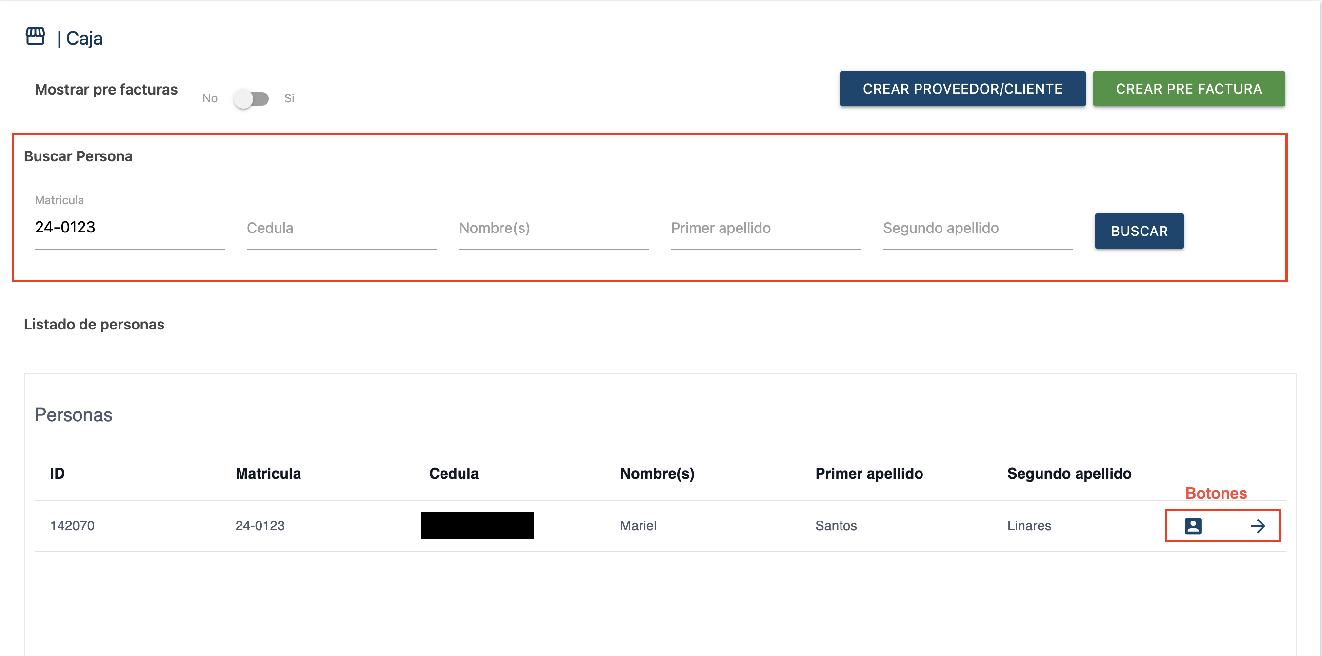 Al final de cada elemento de la lista, existen dos botones de acción: "Ver solicitud" y "Continuar". Ver solicitud te lleva a un modal dónde se visualizan las solicitudes de admisión de esa persona y Continuar te lleva a la vista de "Caja de Servicios".