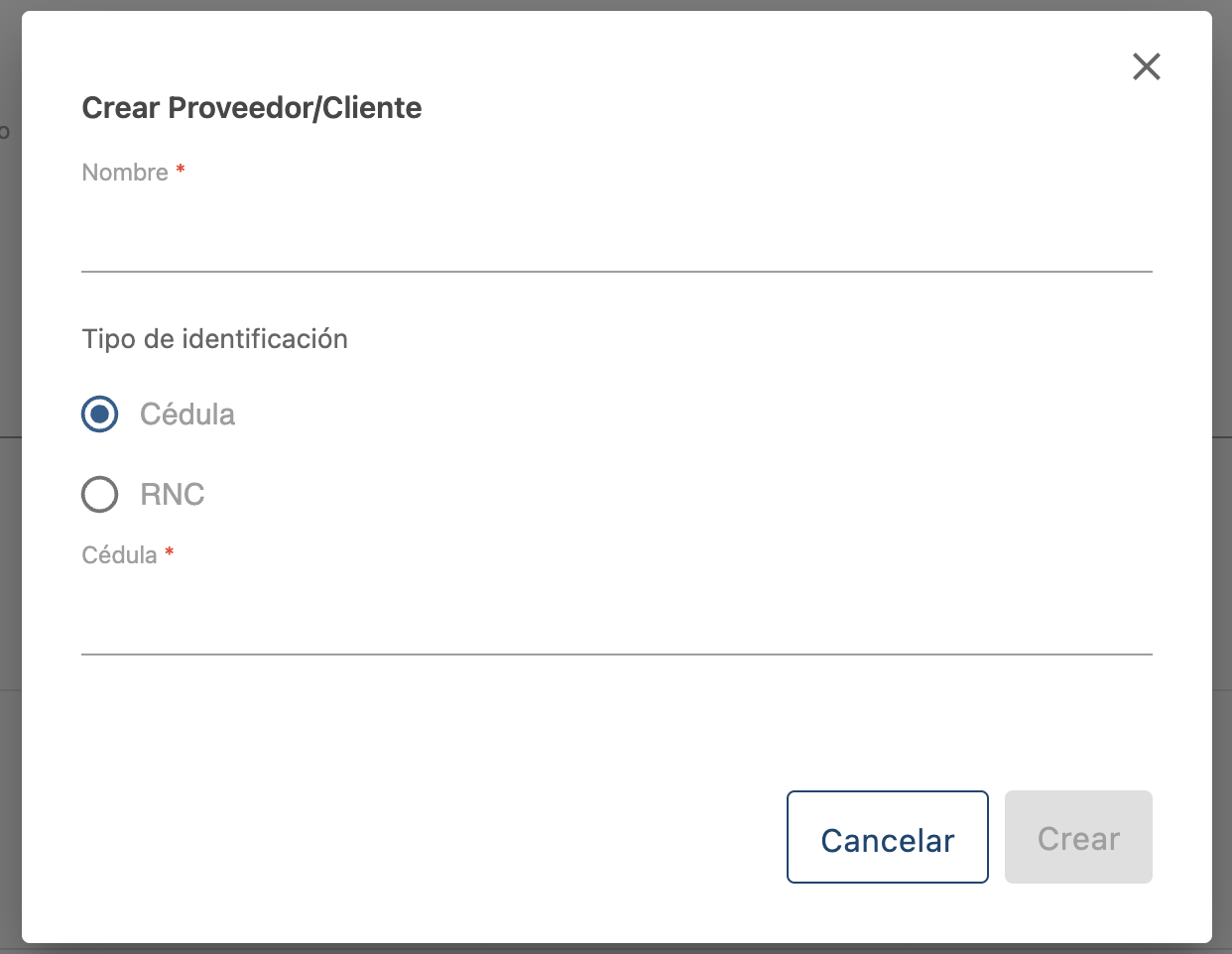 Para crear un proveedor or cliente, inserte el Nombre del proveedor, el "Tipo de documento", la cédula o RNC y luego presionar el botón "Crear"