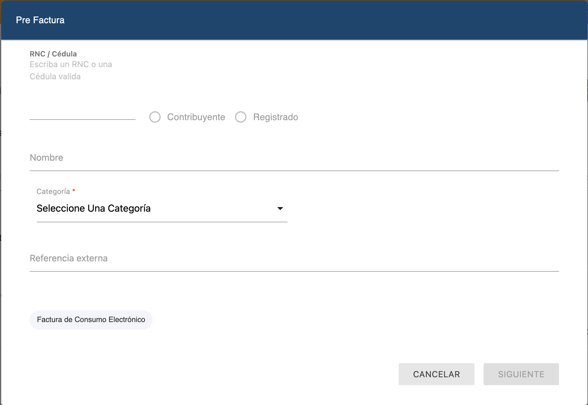 Complete la información de Cédula o RNC, luego seleccione el tipo: "Contribuyente" o "Registrado". De encontrar información, el sistema autocompleta el nombre. Relleneel resto de la información necesaria y presione "siguiente"" para ir al segundo paso.