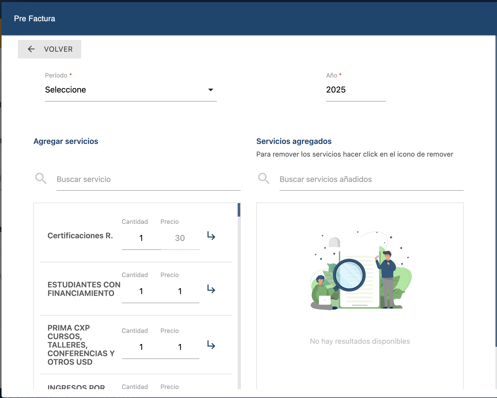 Una vez en el segundo paso, seleccione el Periodo, Año y los Servicios que desea agregar y luego presiona "Confirmar".