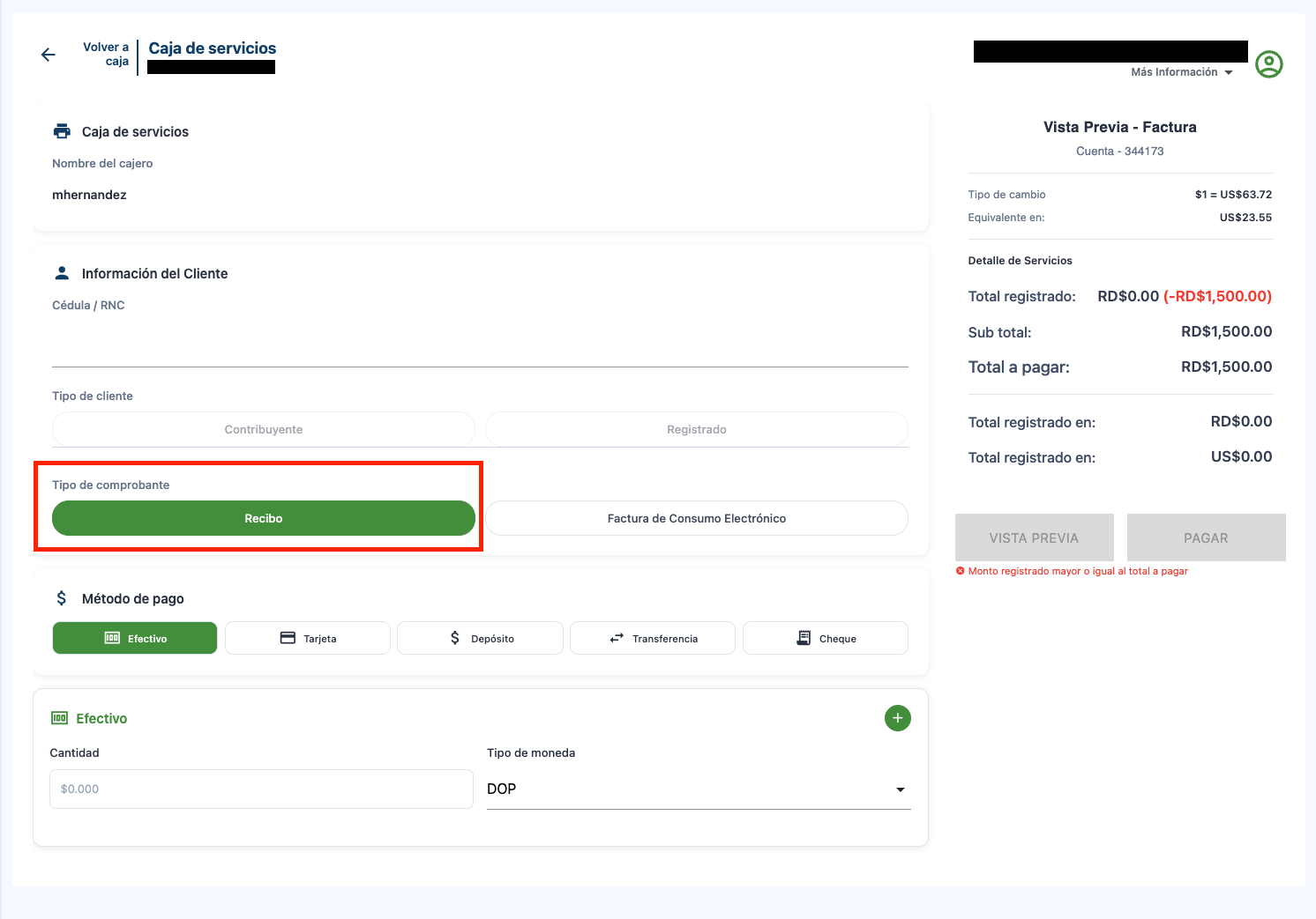 Si desea emitir un Recibo sin compobante fiscal, en lugar de elegir "Factura de Consumo Electrónico", debe elegir la opción de al lado "Recibo".