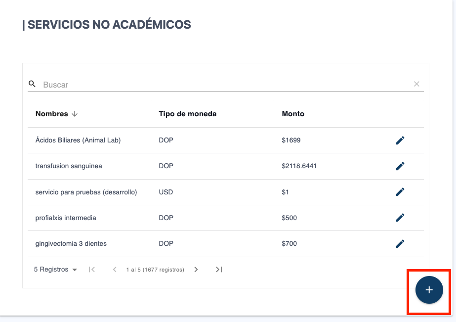 Si desea crear un nuevo "Servicio no Académico", basta con hacer click en el botón que está en la esquina inferior derecha de la vista y esto lo llevará a la vista de creación o edición de un nuevo servicio.