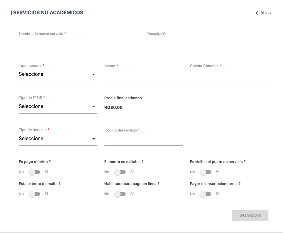 Una vez en la vista para la creación del servicio, complete todos los campos y presione el botón "GUARDAR", para proceder concluir la creación o guardar los cambios en caso de edición de un servicio.